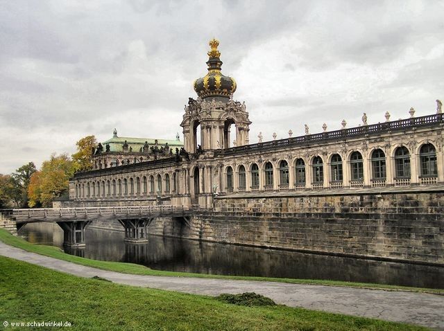 Der Zwinger ist ein barockes Bauwerk und eines der Wahrzeichen der Stadt Dresden (neben der wiedererstehenden Frauenkirche), das zwischen 1710-1732 nach Plänen des Architekten Matthäus Daniel Pöppelmann und dem Bildhauer Balthasar Permoser im Auftrag von August dem Starken auf den Resten der Festungsmauern einer alten Bastion entstand. Er befindet sich zwischen der Semperoper und dem Postplatz. Der in aller Welt bekannte und wohl der am meisten fotografierte Teil des Zwingers ist das Kronentor mit der Langgalerie, dem Wallpavillion und dem Glockenspielpavillion sowie den verbindenden Bauteilen. Die Spitze des Tores wird von einer Nachbildung der polnischen Königskrone geziert. Genau gegenüber dieses Tores auf der Westseite, das den Ausgang zum Staatsschauspiel, nicht zu verwechseln mit der Semperoper, bildet, befindet sich ein weiteres Portal mit Blick auf ein Reiterdenkmal auf dem Theaterplatz. Eine Besonderheit ist das sogenannte Nymphenbad, "ein Festsaal unter freiem Himmel". Die die Nordseite des Zwingerhofes abschließende Gemäldegalerie von Semper gehört im engeren Sinne nicht dazu. 1924-36 wurde der Zwinger unter Hubert Ermich saniert, er leitete auch den Wiederaufbau nach 1945.